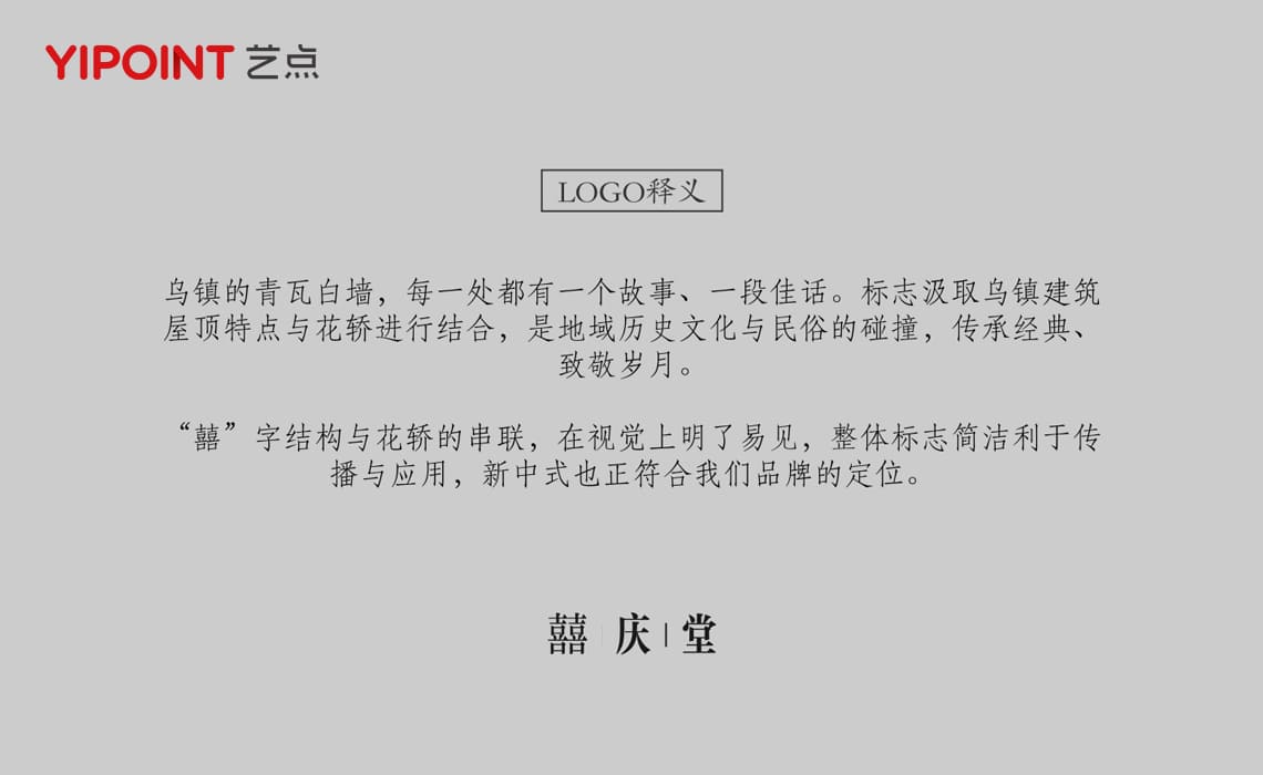 在形象塑形方面,我們認(rèn)為整體囍字的運(yùn)用符合喜慶禮堂的品牌主題,logo上方的弧形運(yùn)用了江南小橋的元素,logo下方的橫豎起伏糅合了江南房屋的特色,整體形象深度迎合江南的地區(qū)特色,以及文化底蘊(yùn),使品牌的意識(shí)更深入客戶的心,從品牌視覺上,提升自身軟實(shí)力,結(jié)合優(yōu)秀的設(shè)計(jì)美化,在當(dāng)代人猶如沙漠般婚姻道德意識(shí)中,讓囍慶堂化為甘泉,涌出寧謐和安慰,使人洗心滌慮,怡情悅性
